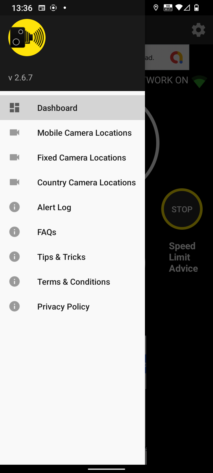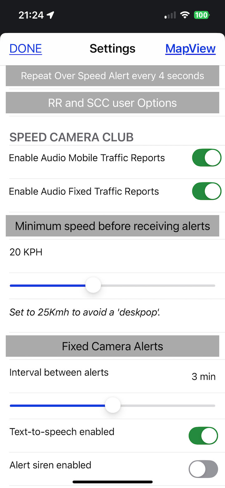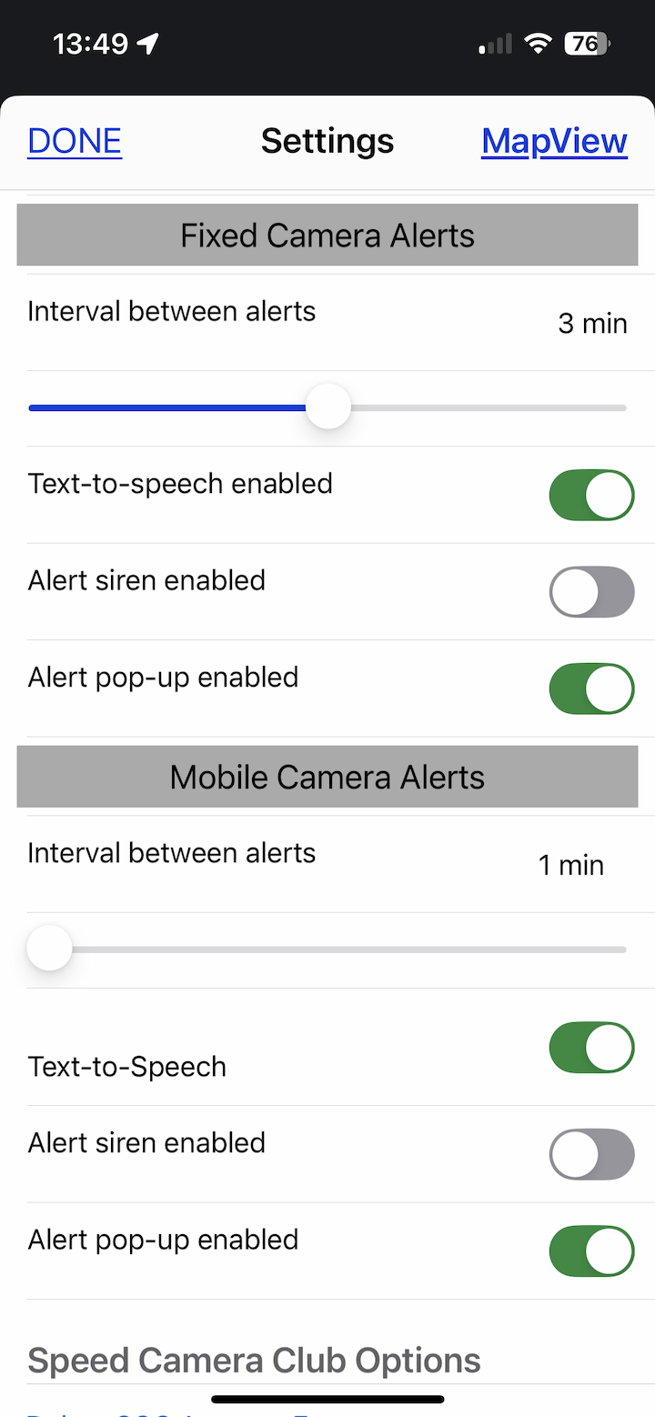 Settings options for Speed Camera Alerts