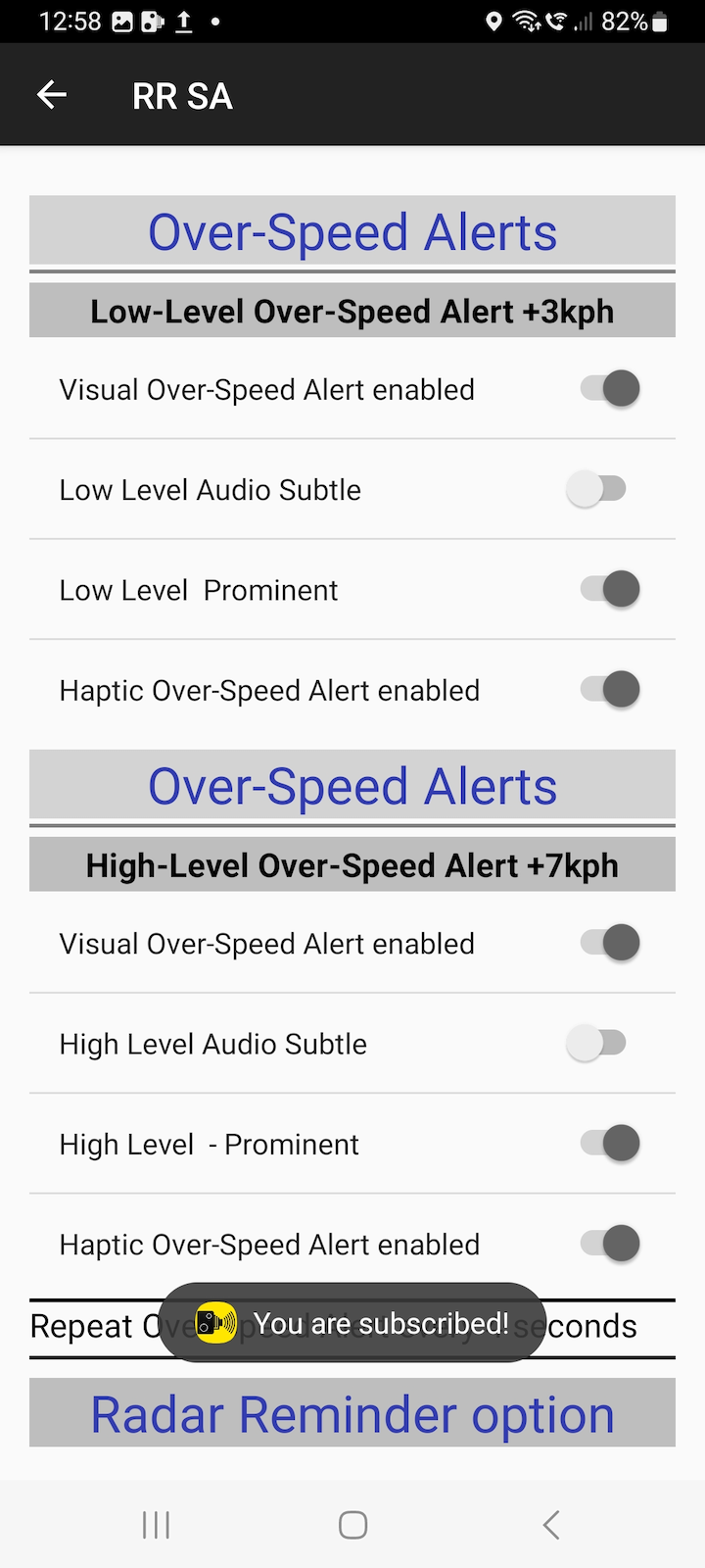 Radar Reminder Android Menu