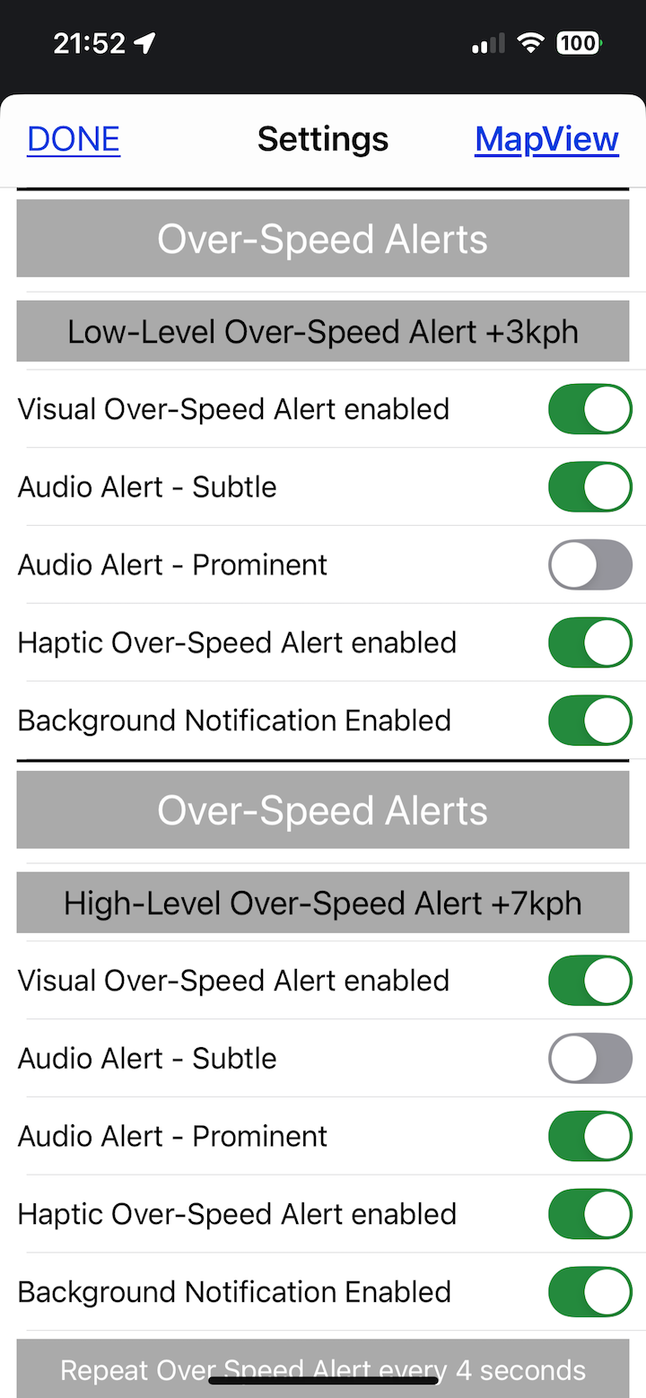 Settings options for Over-Speed Alerts